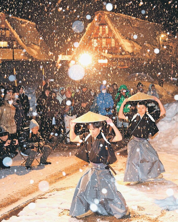 雪が降る中、大勢の観光客やカメラマンが美しい情景を楽しんだ。五箇山民俗館前では、越中五箇山民謡保存会の踊り手が「麦屋節」と「といちんさ」を披露した。