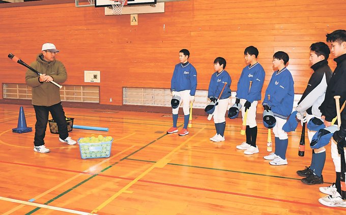 川村さんは投打の基礎を指導し、ピッチングではボールの握り方のこつを伝えた。打撃では片手でバットを振り、「肘を締めて体が開かないように」「下半身を使ってコンパクトに」などとアドバイスした。選手たちは真剣な表情で耳を傾け、実践していた。