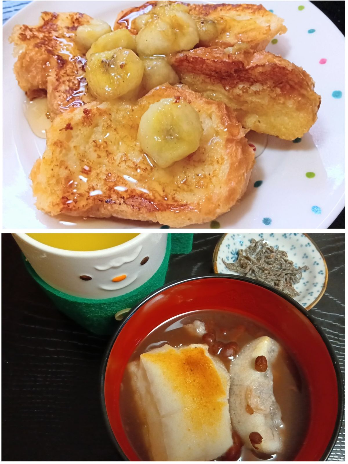 自宅でも、あったかおやつを作ります。余り物のバゲットとバナナでフレンチトースト、甘酒を使ったぜんざい、ワッフルなど。