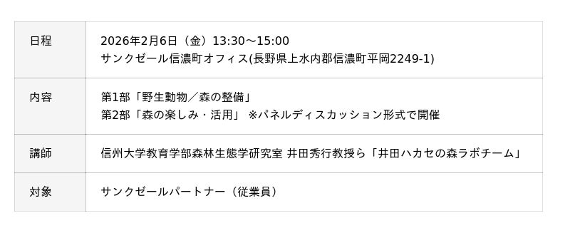 株式会社サンクゼール(本社:長野県飯綱町/代表取締役社長:久世良太)は、2026年2月6日(金)、パートナー(従業員のこと。以下、パートナー)を対象としたイベント『「サンクゼールの森」をおもしろく学ぶ!井田ハカセ率いる“森ラボチーム”の特別教室』を実施いたしました。