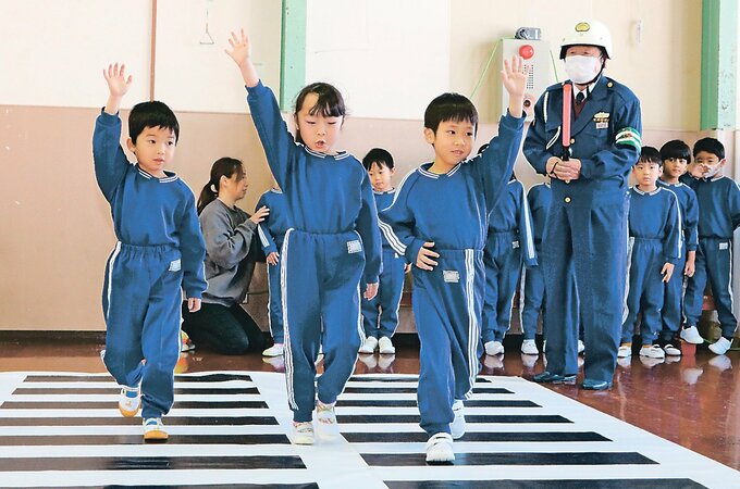 射水交通安全協会牧野支部(越後満支部長)が毎年開いている。園児はアニメと射水署員による紙芝居で、道路に飛び出す危険性などを確かめた。横断歩道に見立てたシートの上を歩く練習では、左右を見て車が来ていないことを確認してから、手を上げて渡った。