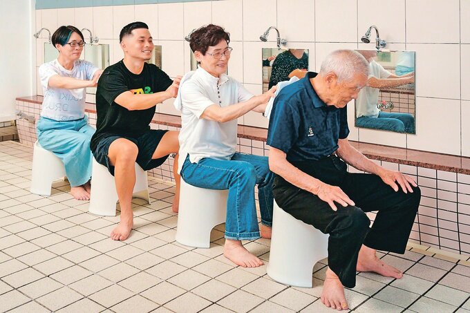 スタジオとして活用を始めたのは一昨年から。常連客の鍛野定雄さん(88)とその家族から撮影を頼まれたのがきっかけだ。海外に住む孫の金三津龍人さん(34)が帰国するのは年1回程度。つながりを確かめられるようにと、集まって写真に残すことを思い付いた。場所として選んだのが、なじみの「平成松の湯」だった。依頼を快諾した黒崎さんは、浴場や脱衣場を使うことを提案し、ユニークな1枚に仕上げた。