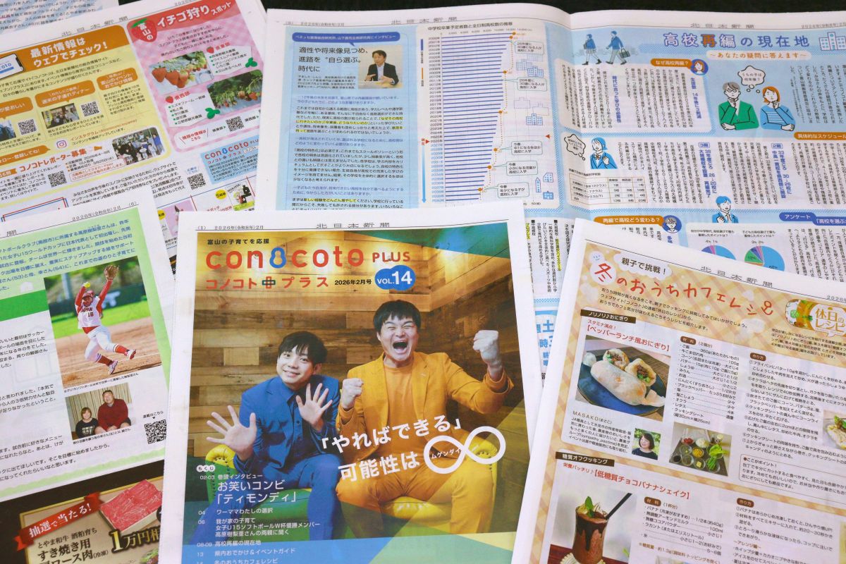 北日本新聞社は13日、子育て世代向けのタブロイド紙「conocotoPLUS(コノコトプラス)」第14号を発行しました。県内全ての小中学校と県私立幼稚園・認定こども園協会所属の各園を通じてお届けします。