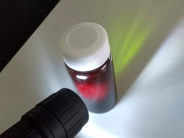 暗い部屋で光を当てると、緑色の液体が赤く光って見えています。