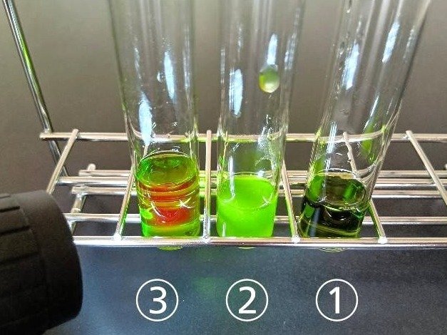家庭で用意できる3種類の緑色の液体を並べて、光を当ててみました。