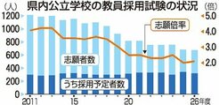 人材の獲得競争が激化し、県内の志願・採用倍率は近年低迷が続く。26年度採用の志願者数は、過去最低だった25年度と同数の678人。採用予定者数の減少により倍率は0・1ポイント上昇し2・1倍となったものの、低水準が続く。採用倍率は1・6倍で、過去最低を更新した。