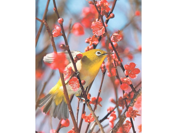 富山県中央植物園(富山市婦中町上轡田)の梅林では、香りに誘われたメジロが「チーチー」とさえずりながら枝の間を飛び交った。射水市の大学生、小西柚月さん(21)はレンズを向け、「メジロに出合えてラッキー。でも動きが速くて撮るのが難しい」と苦笑いしていた。