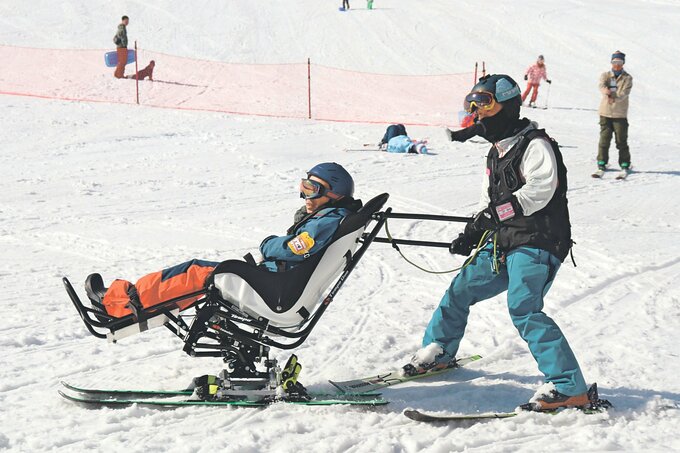 障害があっても楽しめる着座式スキー「カートスキー」の乗車体験会が14日、富山県砺波市五谷のとなみ夢の平スキー場で開かれ、子どもから大人までの7人が乗り心地や安全性を確かめた。