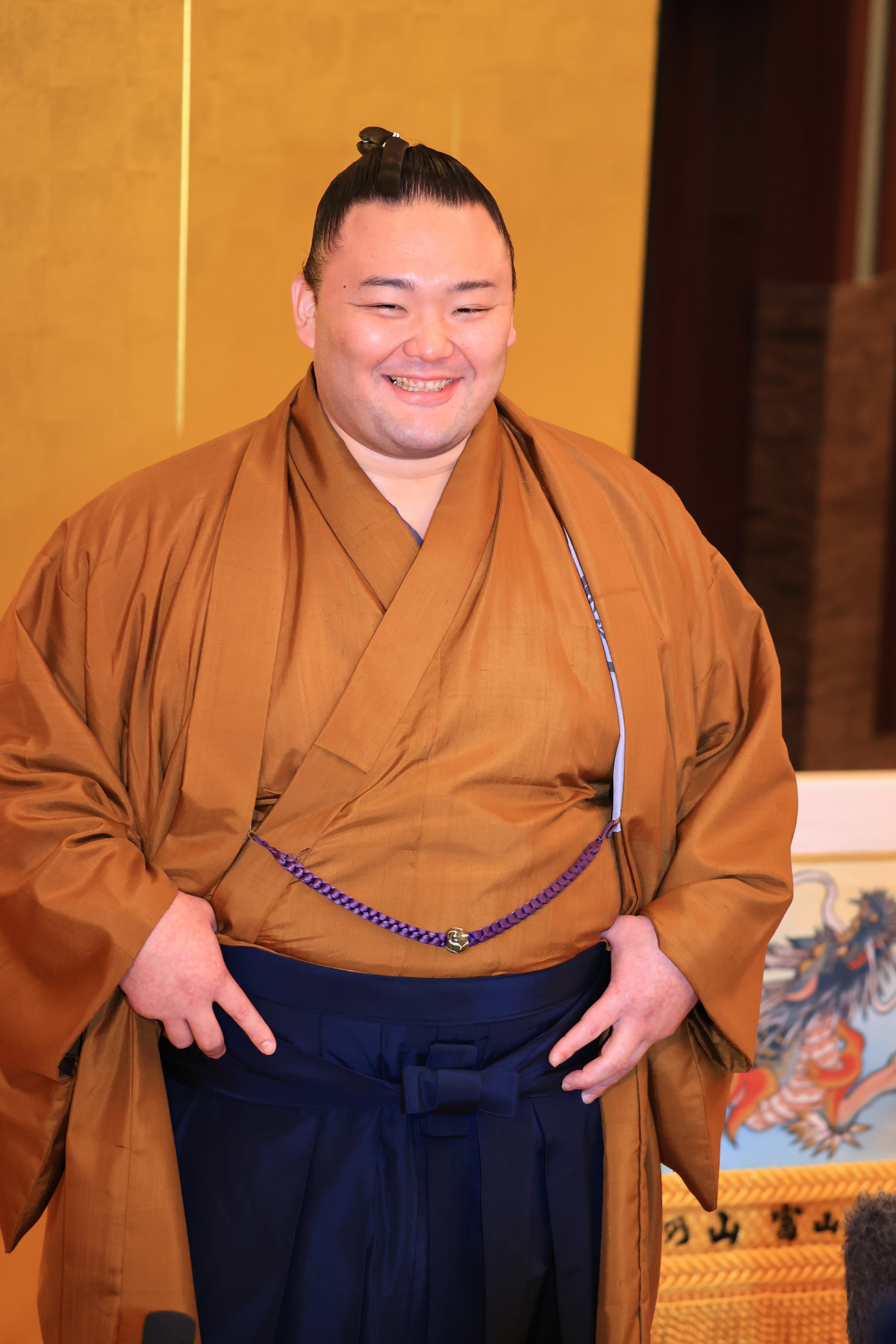 激励会の前に、笑顔を交えながら報道陣のインタビューに答える朝乃山