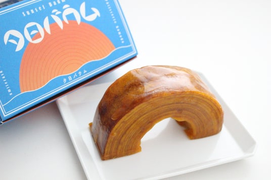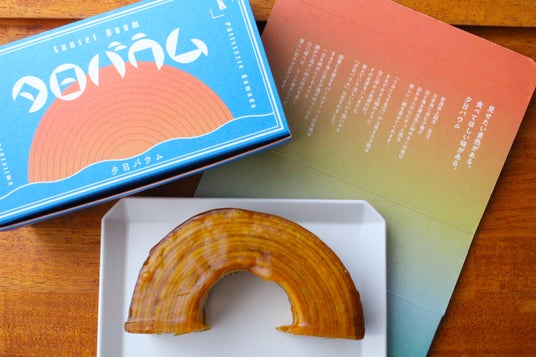 「夕日バウム」は当道の駅から望む荘厳な夕景の美しさを表現したバウムクーヘンであり「うみてらす名立を訪れた方が、その光景をいつまでも覚えてほしい」という想いから、うみてらす名立創立25周年を記念して誕生した商品です。