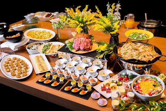 3. 【SNS映え】幸せを呼ぶミモザ色のデザート&デコレーション ミモザの花に見立てたサラダや、淡いピンクがアクセントの「Spring チョコレートファウンテン」など、思わずカメラを向けたくなる彩り。和三盆ロールやいちごタルトなど、パティシエ特製のスイーツも充実し、最後の一口まで春を演出します。