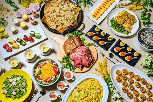 - 【冷製料理】鯛とホタルイカのカルパッチョ/ミモザサラダ/菜の花とベーコンのキッシュ/海草サラダ 源助大根ドレッシング/サーモンマリネ/枝豆とマッシュルームのバジルドレッシング和え/生ハムとカリフラワームース/卵のファルス/春キャベツサラダ 温玉ソース/ポテトサラダ