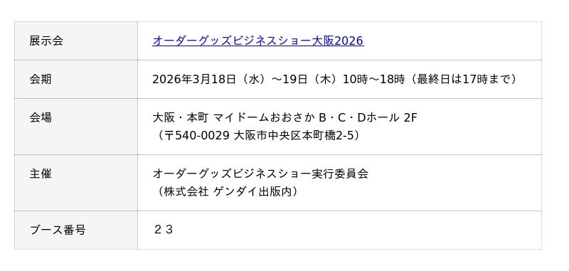 「オーダーグッズビジネスショー大阪2026」は、日本最大・スタンプビジネスとウエアプリント、オリジナル&SPグッズの商材&製造機器が一堂に集う展示会です。