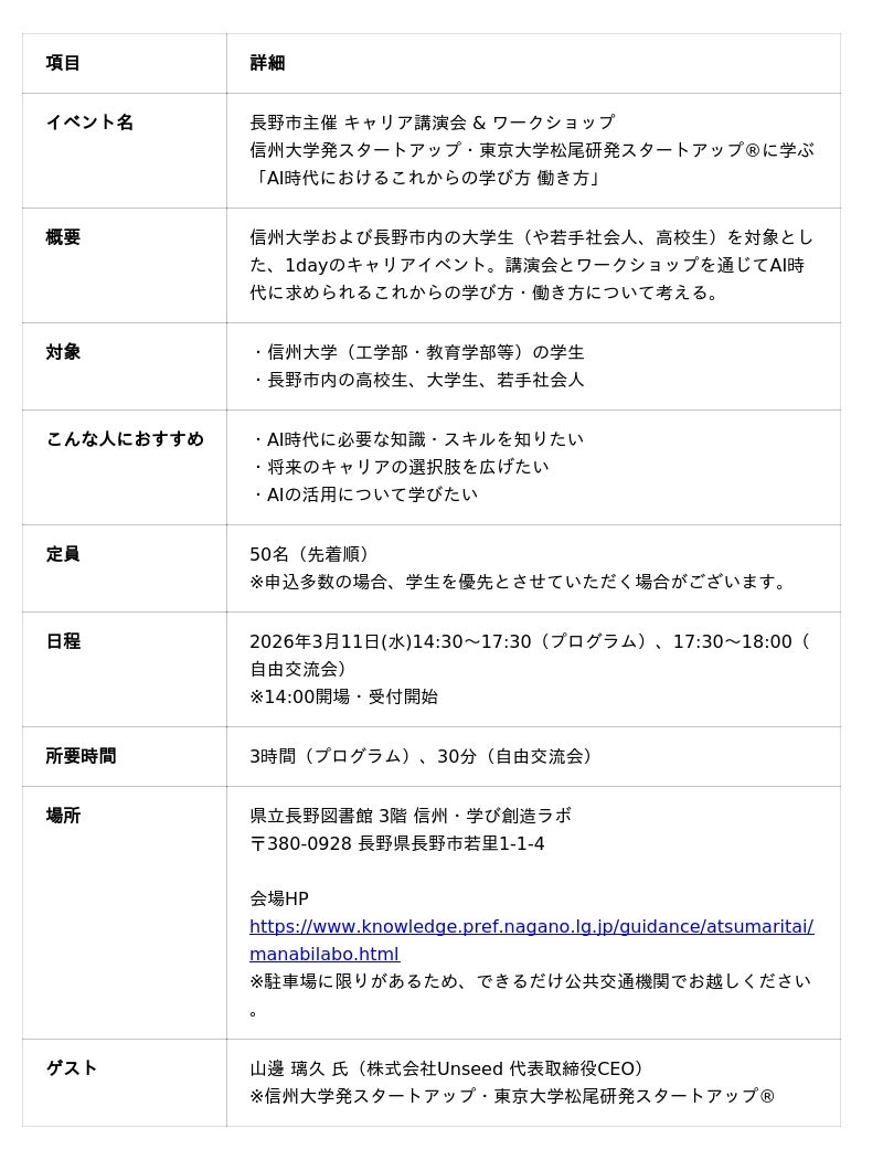 産学官と連携したスタートアップ創出支援を行う株式会社ガイアックス(本社:東京都千代田区、代表執行役社長:上田 祐司、証券コード:3775、以下 ガイアックス)は、長野市主催のもと、信州大学発スタートアップである株式会社Unseed 代表取締役CEO 山邊 璃久氏を招き、「AI時代におけるこれからの学び方 働き方」をテーマにした講演会およびワークショップを2026年3月11日(水)に開催します。