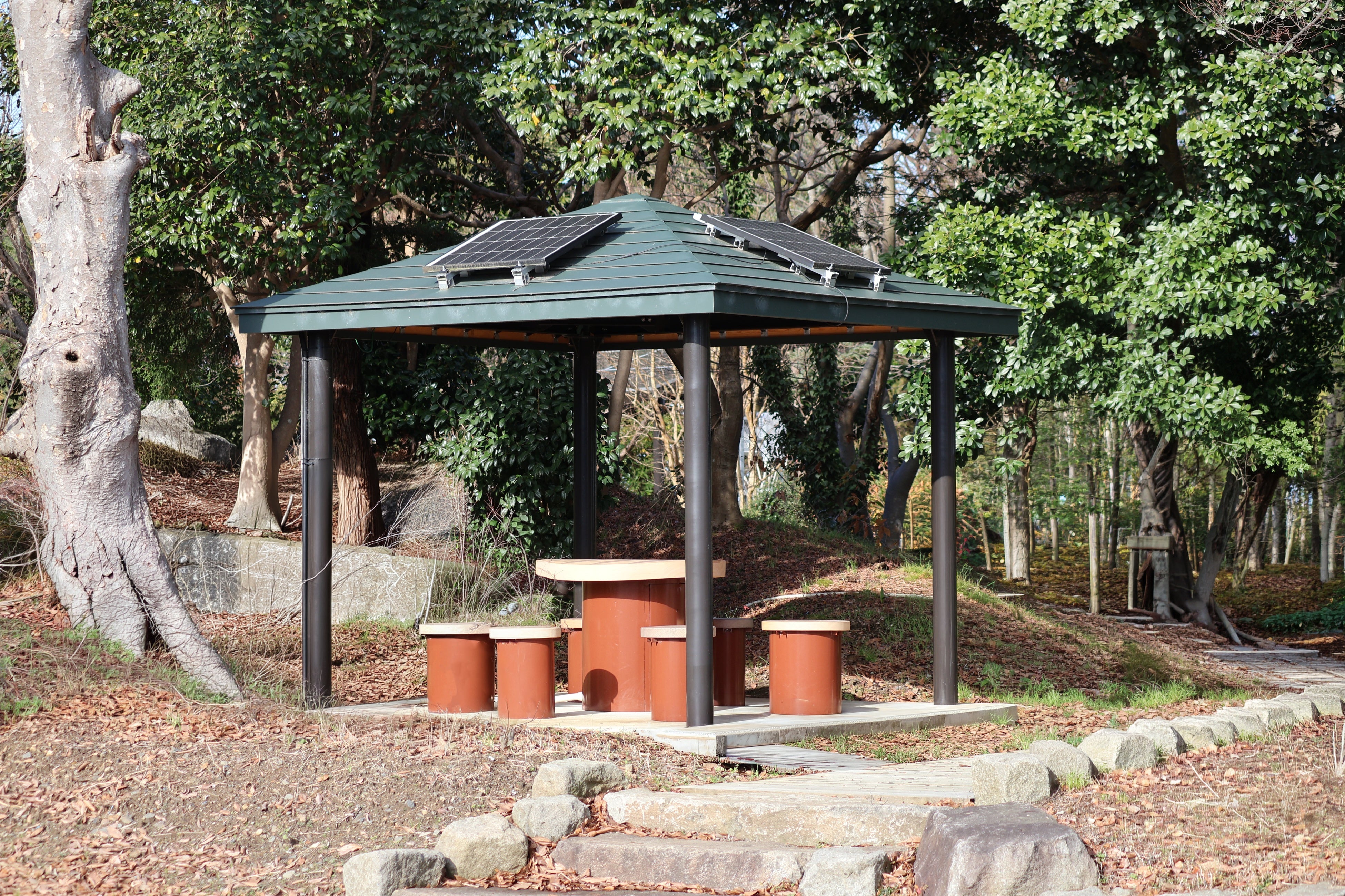 (3)ソーラー東屋(新製品・名称仮)屋根に太陽光パネルが設置されているオフグリッド仕様の東屋。蓄えられた電力は東屋内の照明や災害時の電力として活用が可能。