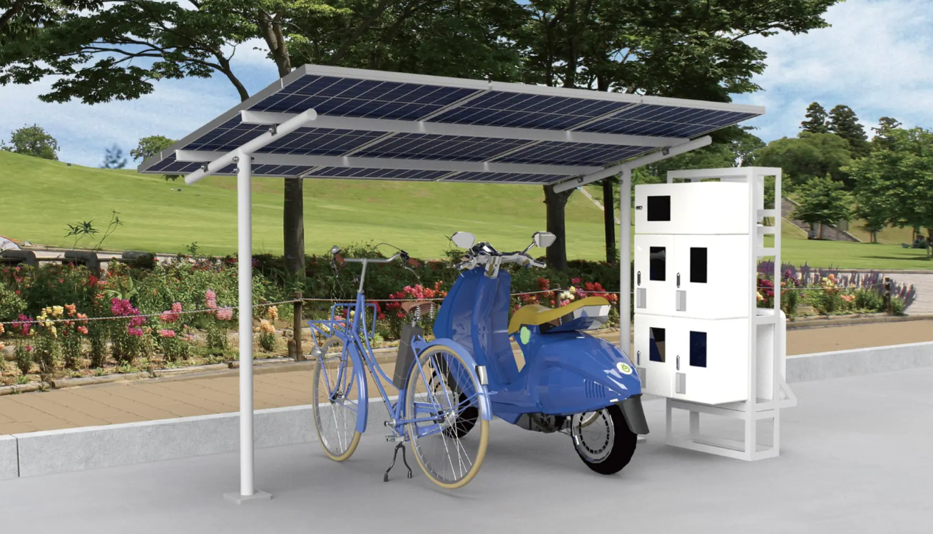 (2)ソライユポート太陽光パネルを屋根材として太陽光発電システムを備えたサイクルポート。発電した電力を蓄電池に蓄え、平常時は電動自転車や電動キックボードの給電に利用できる。また、オフグリッド仕様で非常用電源としても活用が可能。