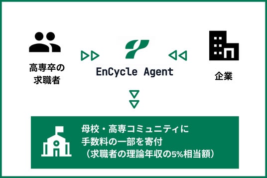 そこでこの度、一般財団法人高専人会と連携することとなりました。本連携により、求職者がEnCycle Agentを通じて希望する企業への入社が決定した場合、その方の理論年収の最低1%相当額を当社が負担し、高専人会へ寄付いたします。