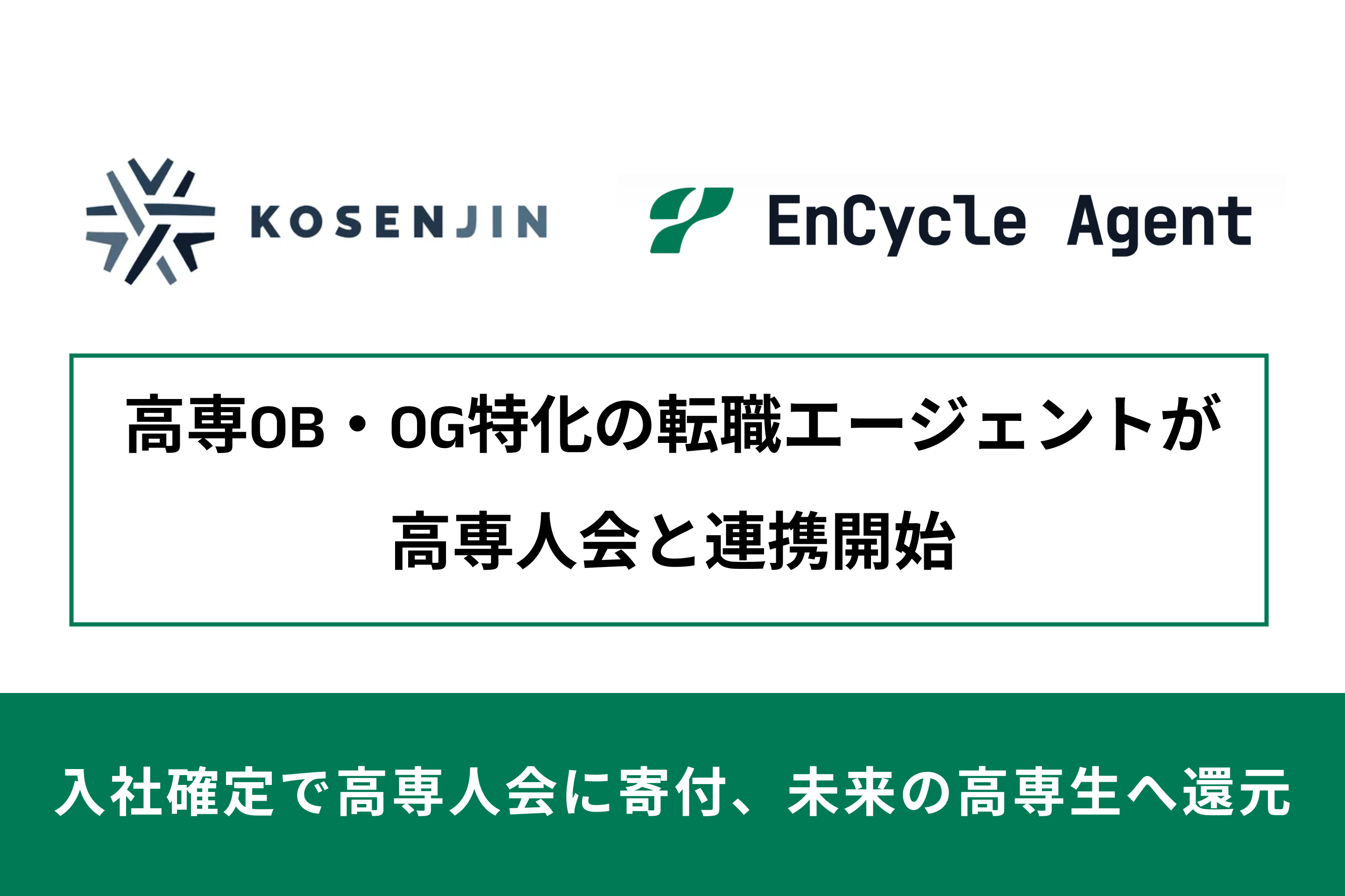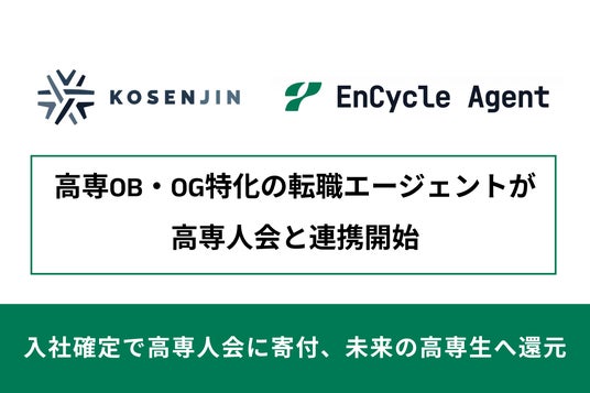 株式会社プロッセル(本社:新潟県新潟市、代表取締役CEO:横山和輝、以下「プロッセル」)が提供する高専卒業生に特化した転職エージェント「EnCycle Agent」は、一般財団法人高専人会(所在地:東京都品川区、代表理事:渋谷修太、以下「高専人会」)と連携したことをお知らせいたします。本連携により、求職者がEnCycle Agentを通じて希望する企業への入社が決定した場合、その方の理論年収の最低1%相当額を当社が負担し、高専人会へ寄付いたします。
