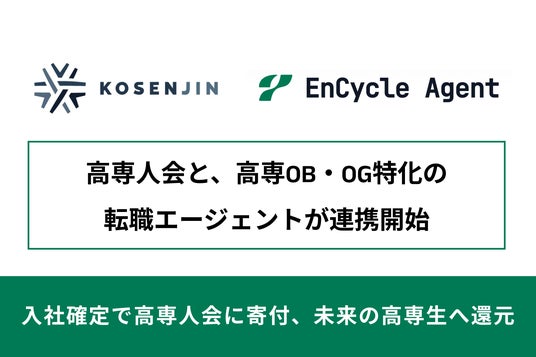 高専OBOGらにより発足した一般財団法人高専人会(東京都品川区・代表理事 渋谷修太)は、株式会社プロッセル(本社:新潟県新潟市、代表取締役CEO:横山和輝、以下「プロッセル」)が提供する高専卒業生に特化した転職エージェント「EnCycle Agent」と連携したことをお知らせいたします。本連携により、高専卒業生がEnCycle Agentを通じて転職に成功した際、プロッセルより紹介手数料の一部(理論年収の1%相当額以上)が寄付されます。寄付金は高専生支援プロジェクトやネットワーク強化の原資として活用し、高専の価値向上に努めてまいります。