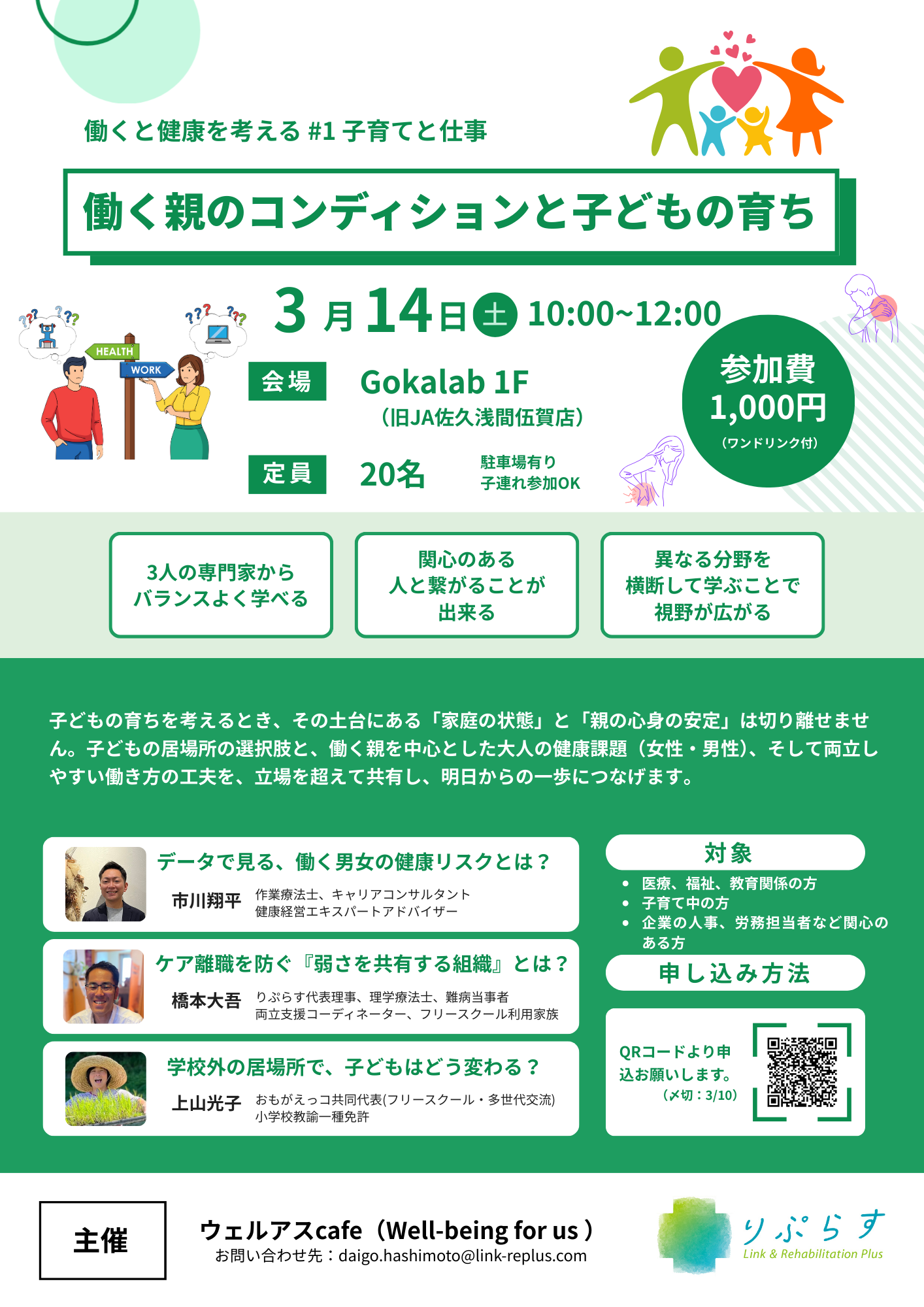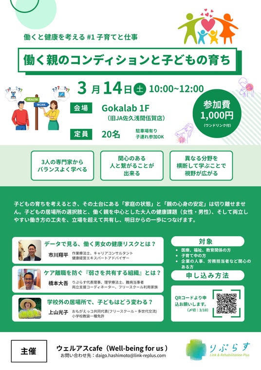 始動に伴い、2026年3月14日(土)、長野県御代田町にてキックオフイベント「働く親のコンディションと子どもの育ち」を開催します。