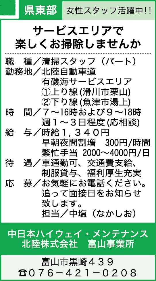 PR 【2月19日掲載】中日本ハイウェイ・メンテナンス北陸株式会社 富山事業所【2026】 2月19日掲載開始分 2026年2月19日 05:00 パート この求人は電話でのみ応募を受け付けております 076-421-0208 担当/中塩(なかしお) この機能は会員限定です。 お気に入りの記事を保存し、マイページで読むことができます。 ログイン 会員登録はこちら