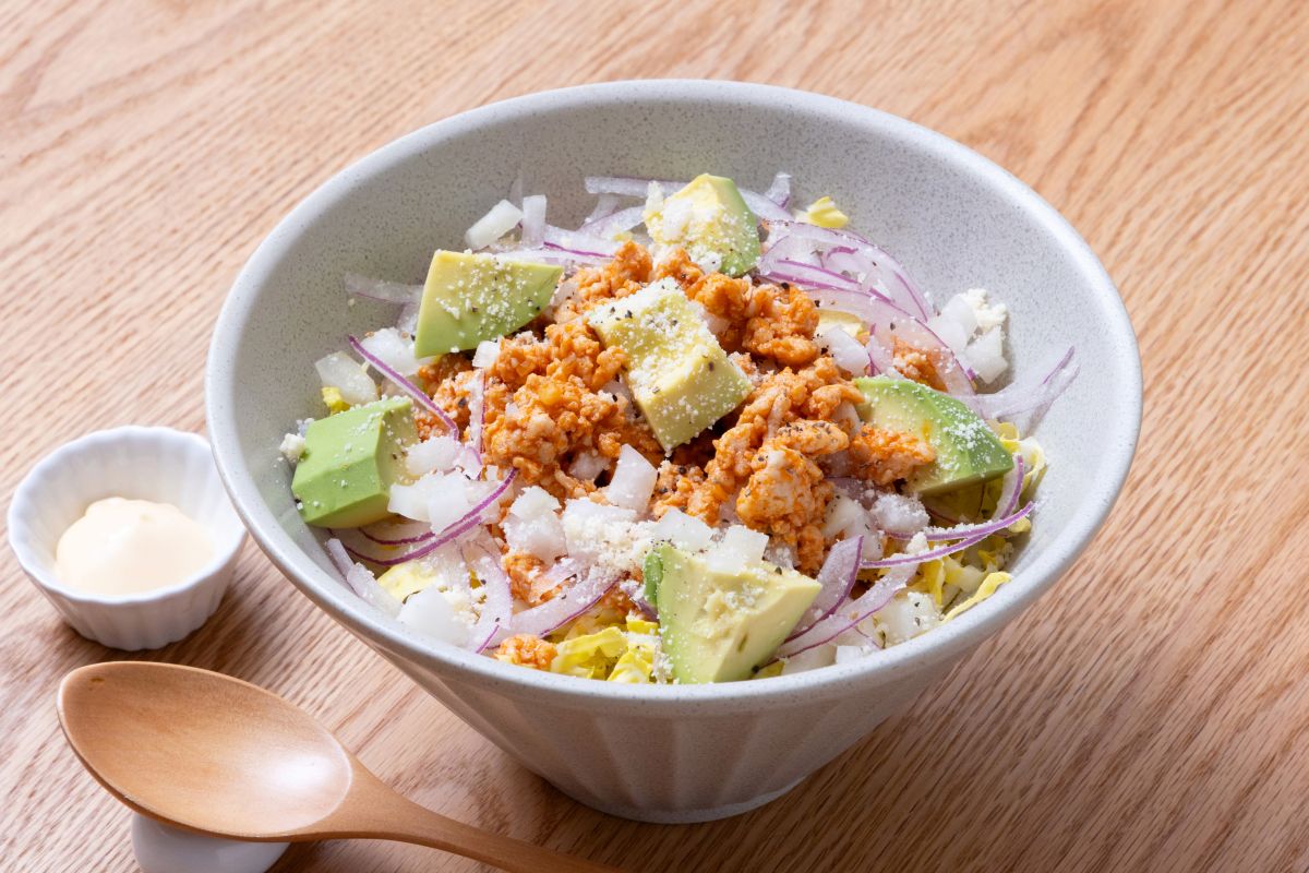 ④ペーパーで水気をとった紫玉ねぎ、アボカドをちらす。