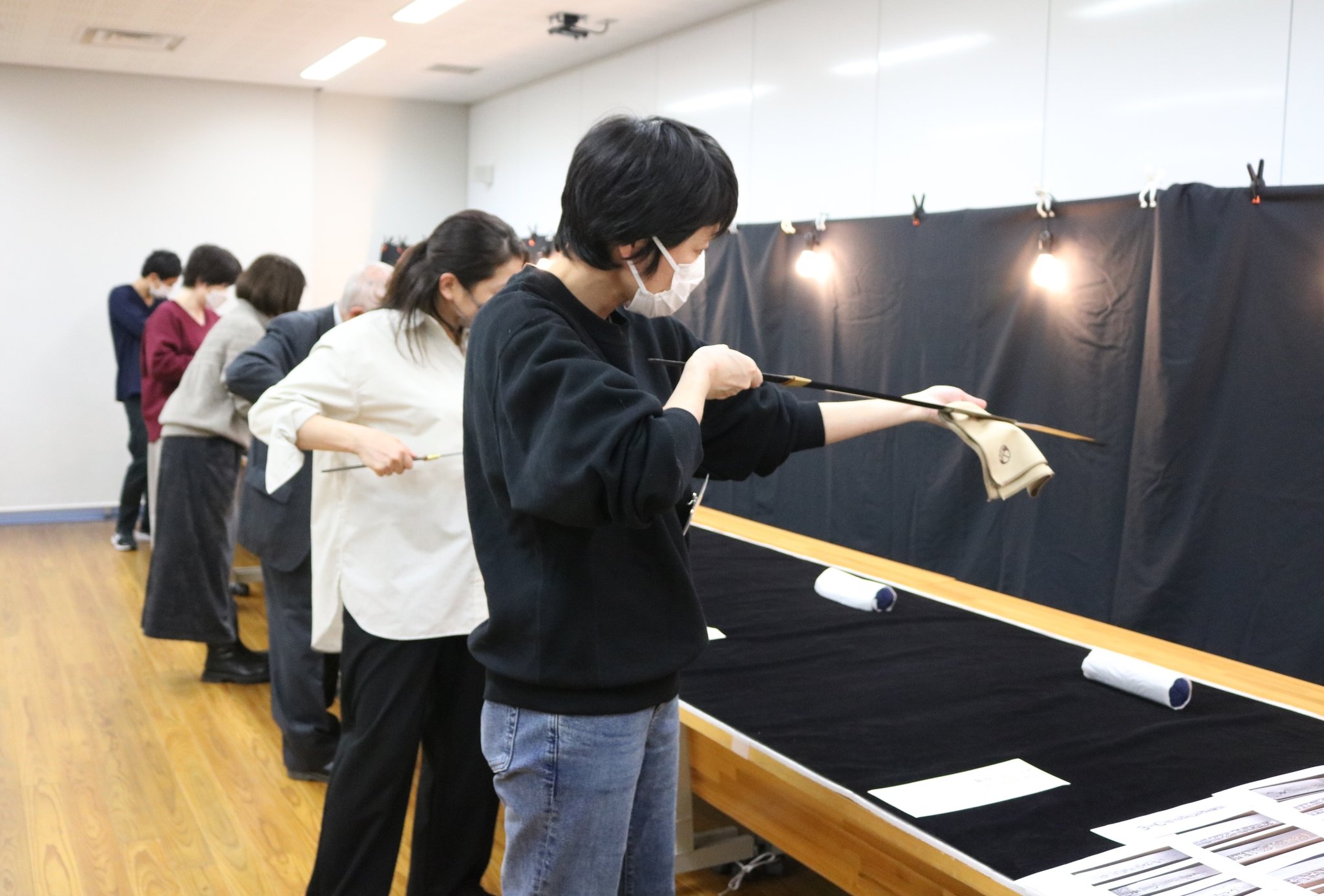 鑑賞会で刀を眺める富山刀剣研究会の会員ら=2025年11月、高志の国文学館