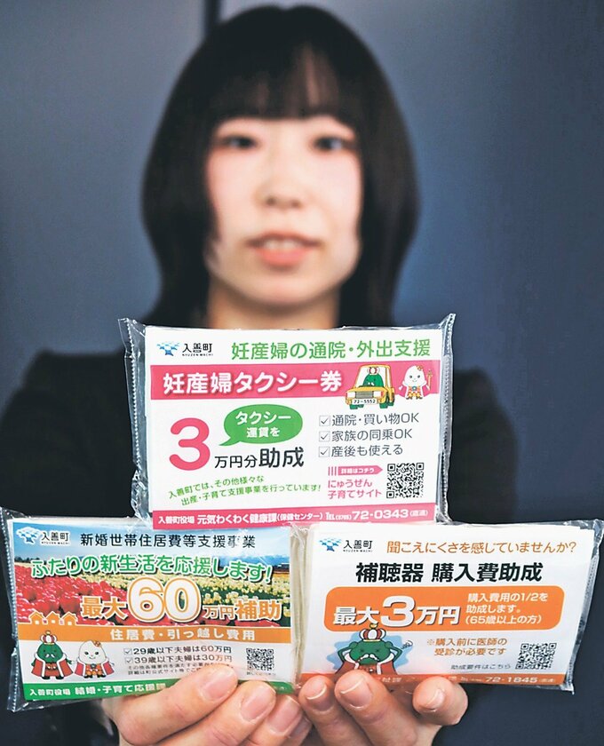 チラシよりも実用的な広報物として住民に受け取ってもらおうと、16日に始まった確定申告相談に合わせて第1弾となる3種類を用意した。元気わくわく健康課は「妊産婦タクシー券(3万円分)」、結婚・子育て応援課は「新婚世帯住居費等支援事業(最大60万円)」、保険福祉課は「補聴器購入費助成(最大3万円)」をアピールしている。