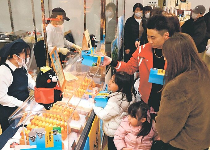 熊本県のPRキャラクター「くまモン」の人形焼き(もなりお)にも親子連れらの列ができていた。