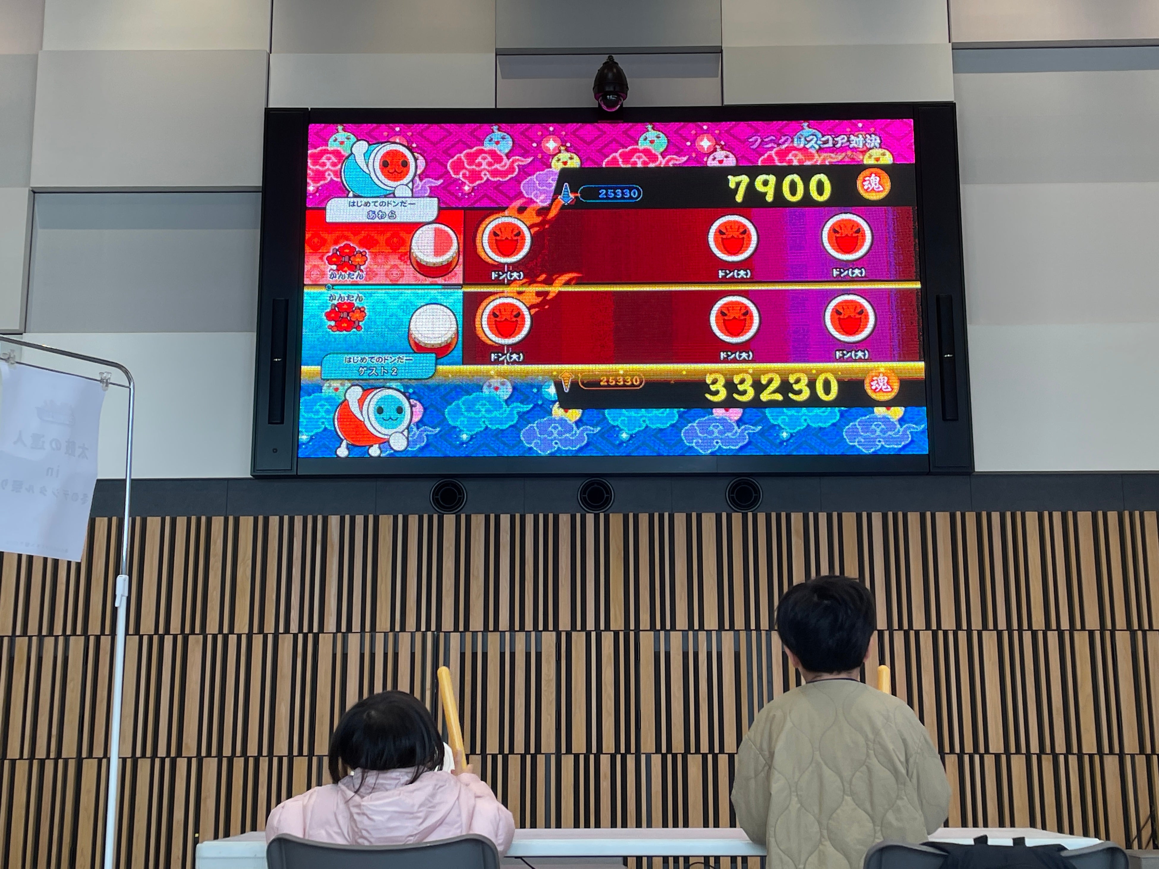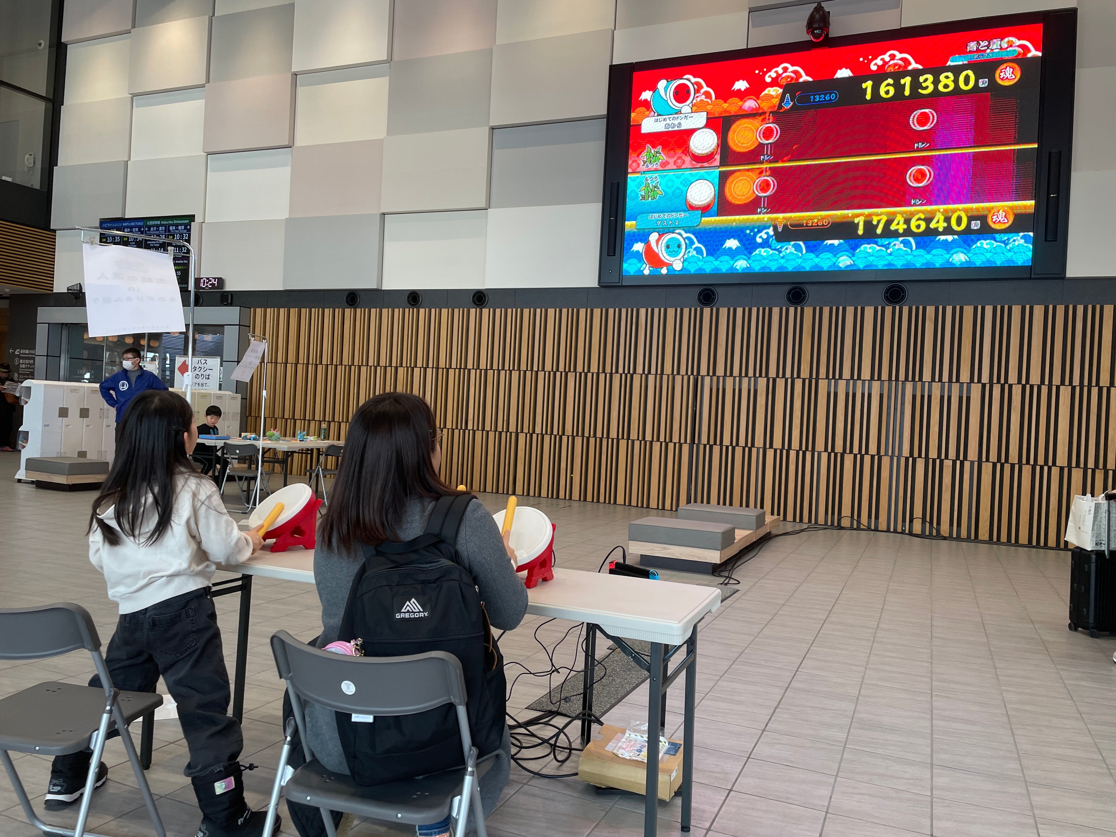 太鼓ゲームに挑戦する親子