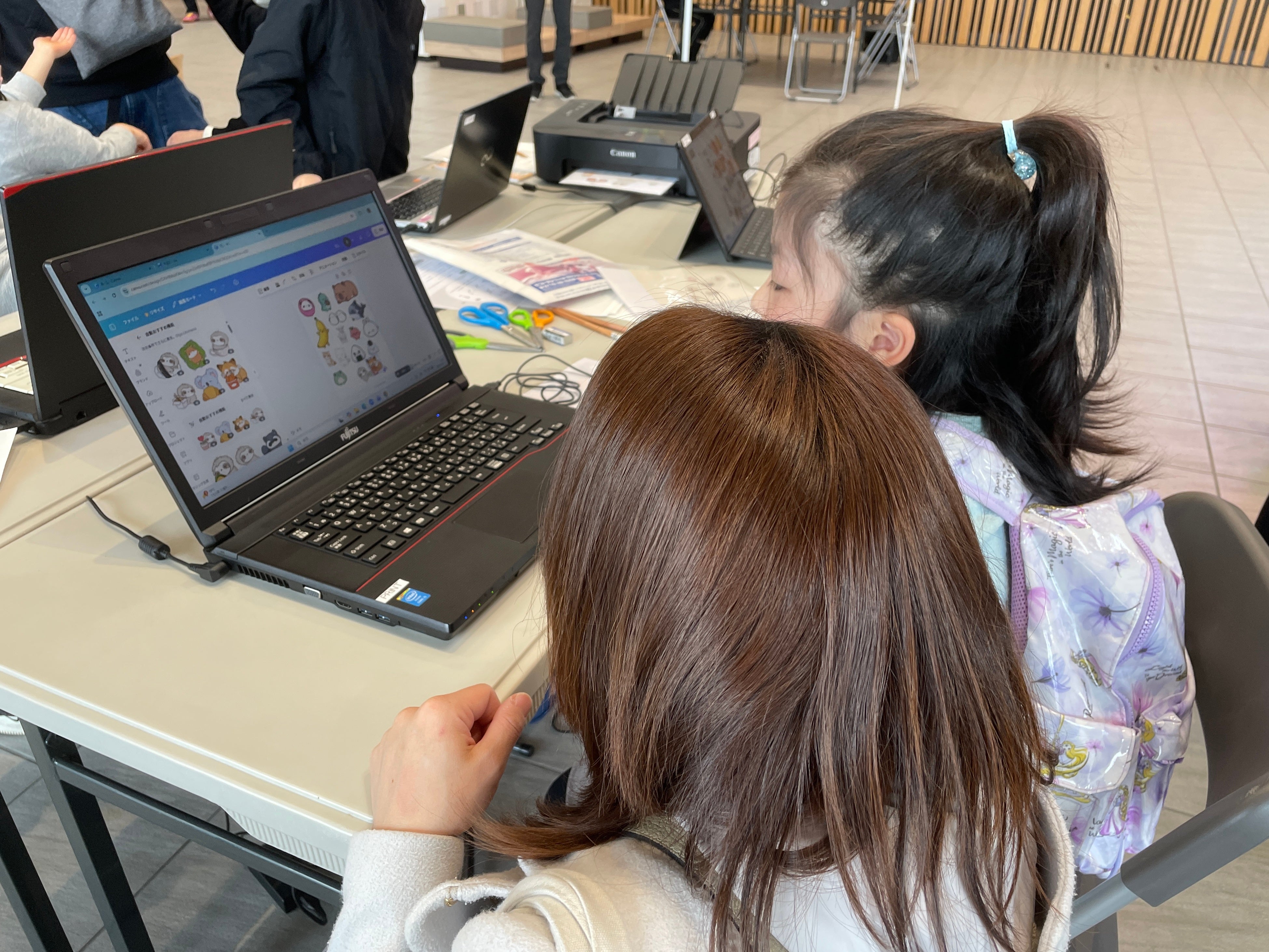 親子でオリジナルのシール作りに挑戦する様子