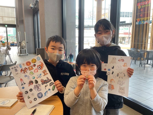 完成したオリジナルのシールを持つ子どもたち