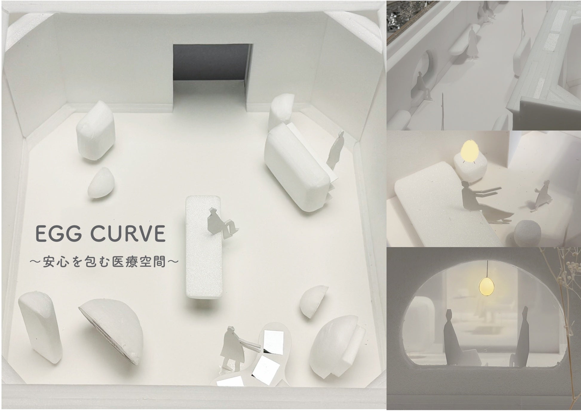 心理的圧迫感を感じやすい無機質な手術室を「たまご」の持つやわらかい曲線を用いた空間にすることで、圧迫感の軽減を狙った提案です。機器や壁、照明など医療空間全体をたまごの曲線から抽出した「エッグカーブ」を基準として設計することで、優しく親しみのある環境へ変えていきます。