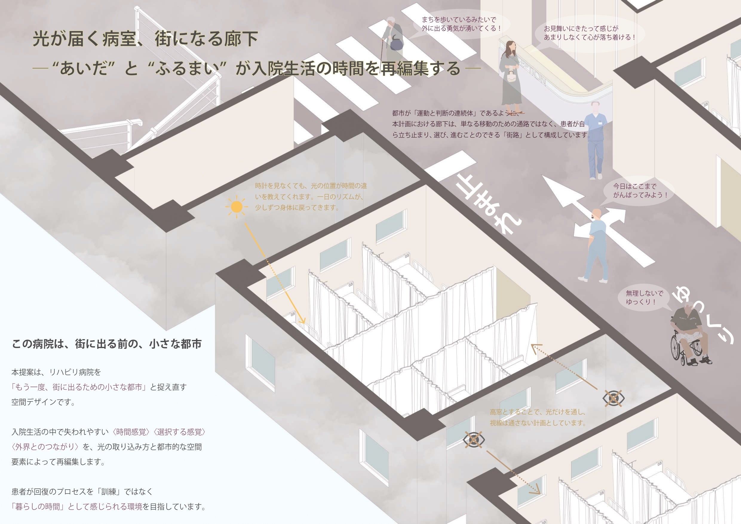 リハビリ病院を「もう一度、街に出るための小さな都市」と捉え、光の取り込み方と都市的な空間要素によって〈時間感覚〉〈選択する感覚〉〈外界とのつながり〉を再編集する設計提案です。回復を訓練ではなく、暮らしの時間として感じ