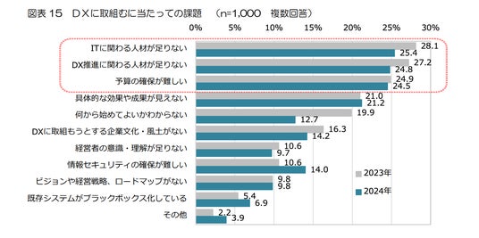 また、DX推進の課題としては「ITに関わる人材が足りない」(25.4%)、「DX推進に関わる人材が足りない」(24.8%)、「具体的な効果や成果が見えない」(21.2%)が上位に挙げられています。