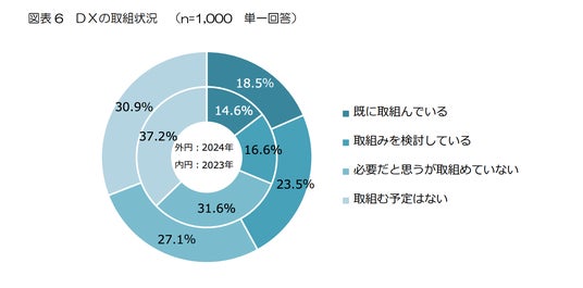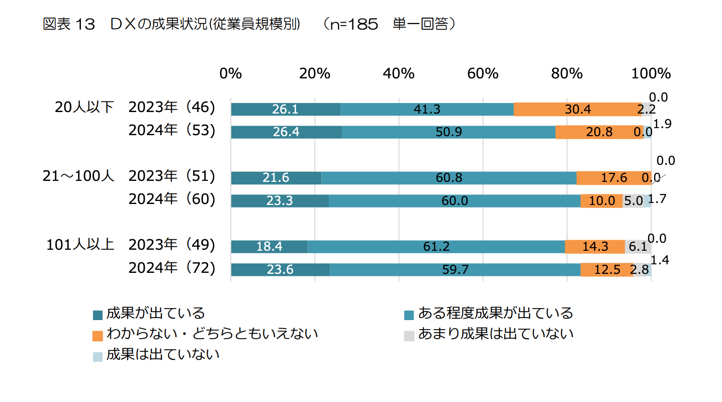 特に従業員20人以下の企業では、DXに「既に取り組んでいる」「検討している」と回答した割合は25.4%にとどまっており、小規模企業ほど実行段階に進みにくい傾向が見られます。