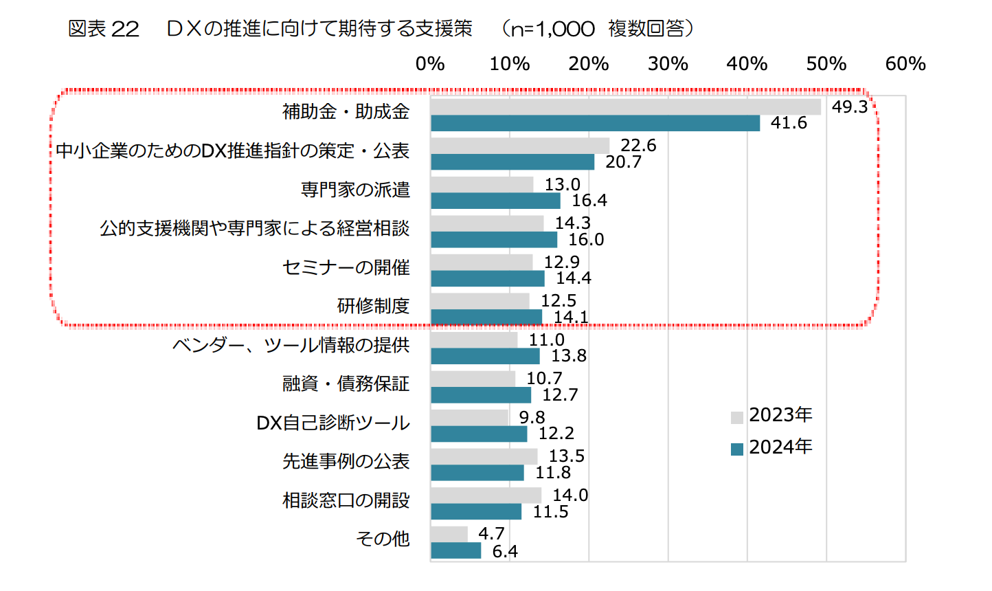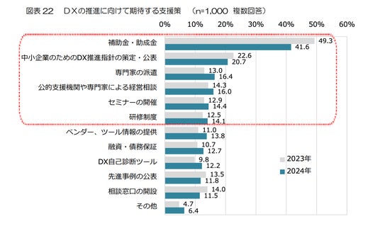 「中小企業のDX推進に関する調査」では、DX推進に向けて期待する支援策として「補助金・助成金」(41.6%)が最も高い一方、「専門家の派遣」も16.4%に上っています。