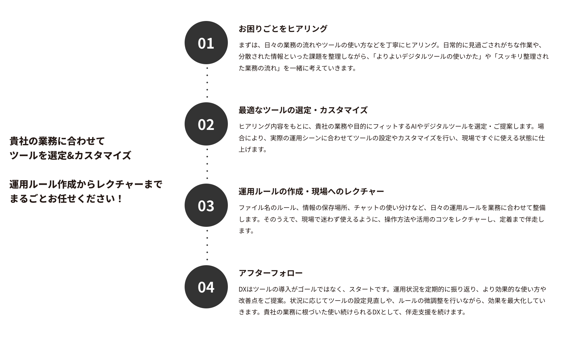 内容:業務ヒアリング、ツール選定・設計、運用ルール構築、現場レクチャー、アフターフォロー
