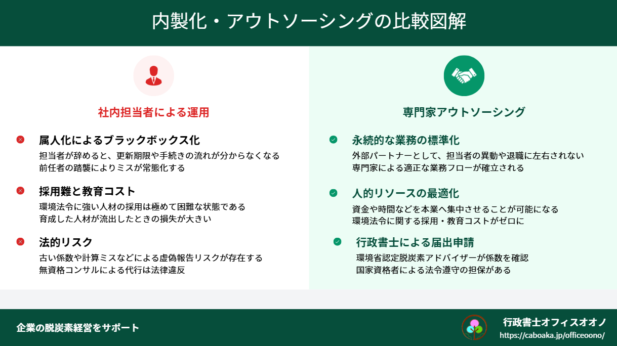 税務を税理士に任せるのと同様に、専門性が高く、かつミスが許されない環境法令対応業務は、外部の専門家にアウトソーシングすべきです。 「社内にノウハウを溜める」のではなく、「社外に確実な機能を置く」ことこそが、結果として企業の持続可能性(サステナビリティ)を高める最短ルートであると当事務所は確信しています。