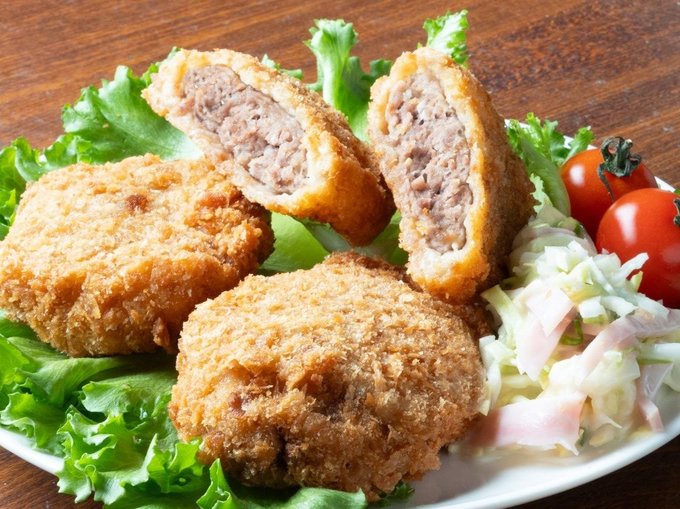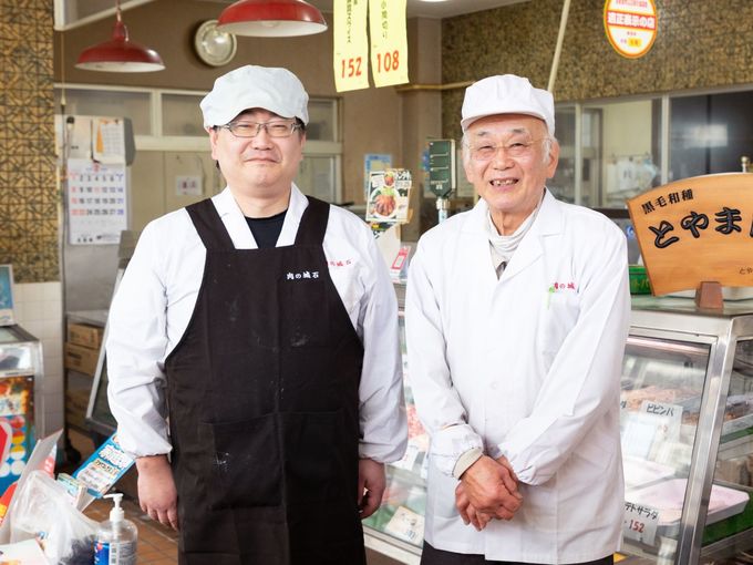 創業113年。3世代にわたって通う客もいるこの老舗精肉店では、揚げ物は全て注文を受けてから揚げる。油の跳ねるにぎやかな音に期待が高まる。揚げたての衣はサクサクで、肉のうまみと玉ネギの甘みが口の中にじゅわっと広がる。味も香りも昔ながらの「肉屋さんのメンチカツ」だ。ミンチには県産肉を使い、硬くならないよう牛肉と豚肉の割合を8対2にしている。