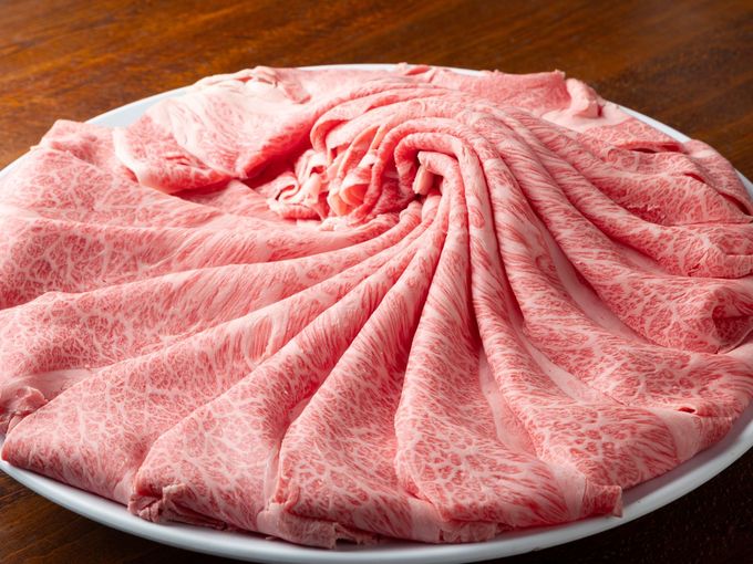 「黒毛和牛肩ローススライス」(100g1,026円) 酒かすを与えて育てたA5ランクのとやま和牛は、サシが細かく入ってとろけるような食感。特別な日に味わいたい