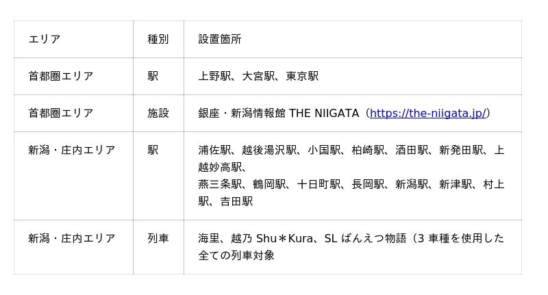 全22箇所(首都圏エリア:駅3箇所・施設1箇所/新潟・庄内エリア:駅15箇所・列車3車種)