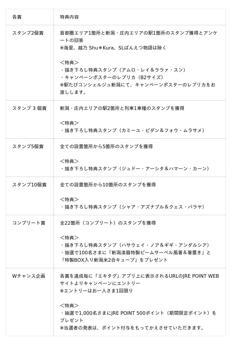 東京駅などの首都圏エリア4箇所と新潟・庄内エリア18箇所の計22箇所のスタンプラリー専用エキタグのスタンプを集めると、限定描き下ろしイラストを使用した特典スタンプなどの賞品を獲得できます。