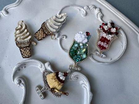 Cotoha(コトハ)さんが手がけた動物形の刺しゅうブローチも。ビーズやスパンコールなどの素材を用い、どんなコーディネートにも寄り添うきらめきと温かみがある。