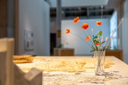 山形から選ばれた川口源太さんは木材やれんが、アスファルトで力強い造形作品を制作。幼少期から見慣れたナガミヒナゲシの花を添え、外来種という存在との関わりを再考する機会を目指した。