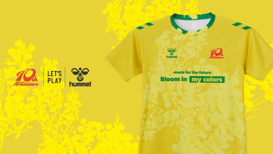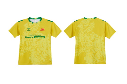 hummel(ヒュンメル)制作のミモザシャツは、国際女性デーのシンボルのひとつにもなっているミモザを全面にデザイン。春の訪れを告げる黄色い花が女性の強さややさしさを表し、襟元にミモザの花と黄緑色の葉を重ねることでアクセントに。胸には取り組みのテーマである「Bloom in my colors.」(ワタシ色に咲こう)を配置し、それぞれの個性や多様性を認め合いながら、自分らしく花を咲かせようという想いが込められています。また、左胸にアランマーレの10周年ロゴを配置した記念モデルとなっています。