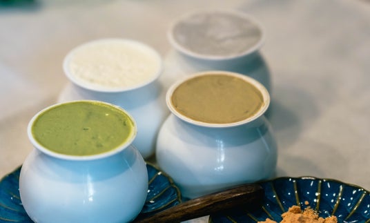 (画面左手前から) クリームわらびもち 抹茶/プレーン/ほうじ茶/黒ごま
