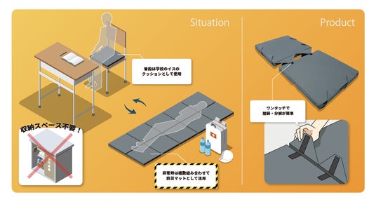 「MATOMAT」は、「普段も、非常時も、いつでも使える防災マット」をコンセプトに、危機管理部局・教育委員会と当社が官民連携で開発したフェーズフリーな防災マットです。 普段は教室などでイスのクッションとして使用し、災害時には複数枚をワンタッチで連結してマットとして利用できるため、別途保管スペースを必要としません。自動車部品の端材をアップサイクルしたウレタンフォームにより、環境配慮と快適性を両立した社会貢献型製品です。