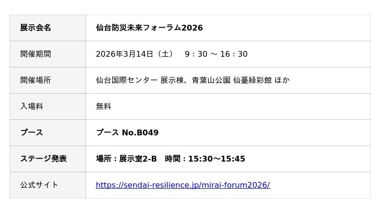 太平洋工業株式会社(本社:岐阜県大垣市、代表取締役社長:小川 哲史)は、リアルタイムで水位を監視し、地図上に浸水状況を表示する浸水検知システム「Watevel(ウォタベル)」を、【2026年3月14日(土)】に開催される「仙台防災未来フォーラム2026」に出展いたします。