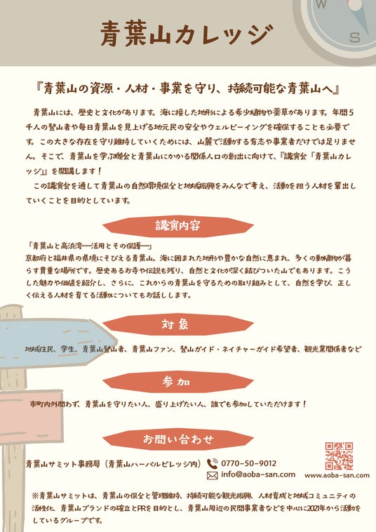 舞鶴市と福井県高浜町は、令和8年3月7日(土)に青葉山ハーバルビレッジにて、青葉山の自然環境保全と地域振興を担う人材を排出することを目的とした講演会「青葉山カレッジ」を開講いたします。